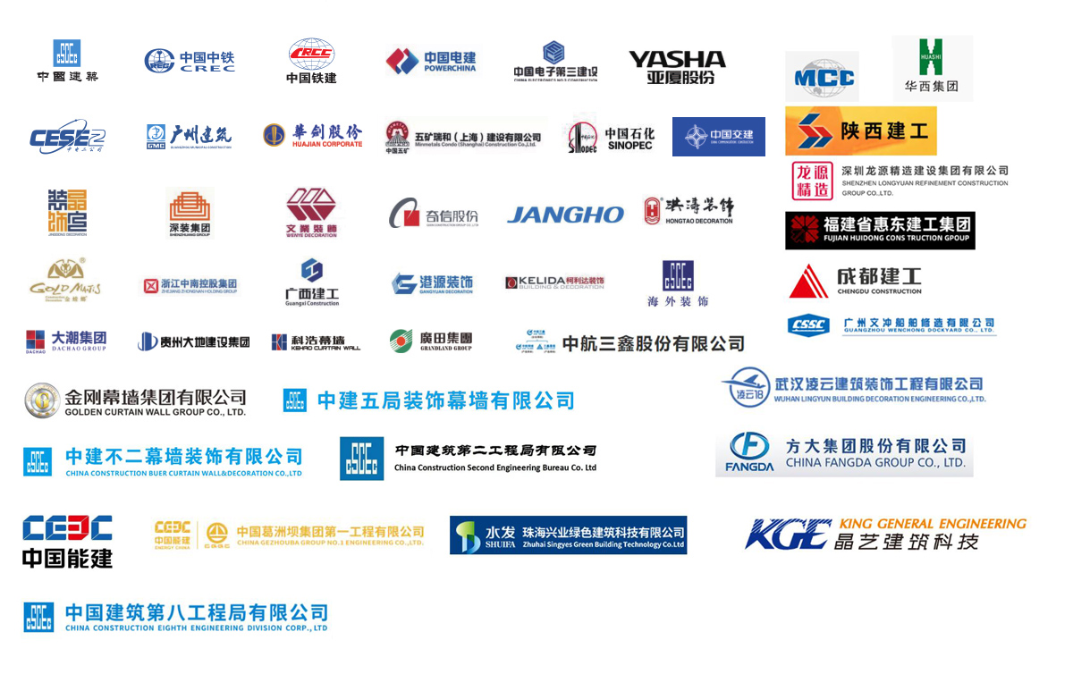 公司參建了諸多大型項(xiàng)目工程,如港珠澳大橋、珠海國(guó)際航展、深圳國(guó)際會(huì)展中心、廣州白云機(jī)場(chǎng)、西安全運(yùn)會(huì)場(chǎng)館、成都東安湖大運(yùn)會(huì)場(chǎng)館、樂山奧體中心、洛陽奧體中心、增城富士康廠房、惠州中海油、陽江核電站、珠三角各地鐵線、高鐵站、廣西桂林機(jī)場(chǎng)、廣西柳州文化廣場(chǎng)、四川成都天府機(jī)場(chǎng)、海南海口美蘭機(jī)場(chǎng)、西安絲路會(huì)展中心、惠州北站等等。與中國(guó)建筑、中國(guó)中鐵、中國(guó)鐵建、中國(guó)電建、中國(guó)交建、中國(guó)中冶、中國(guó)能建、廣東建筑、廣西建工、廣州建筑等大型國(guó)有企業(yè)下屬公司及江河幕墻、金螳螂裝飾等各大建筑裝飾、幕墻裝飾公司達(dá)成長(zhǎng)期友好合作關(guān)系。